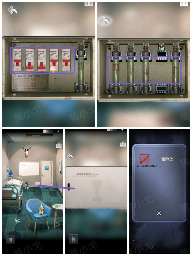 点击配电箱,依据队友线索合闸,取出保险丝。