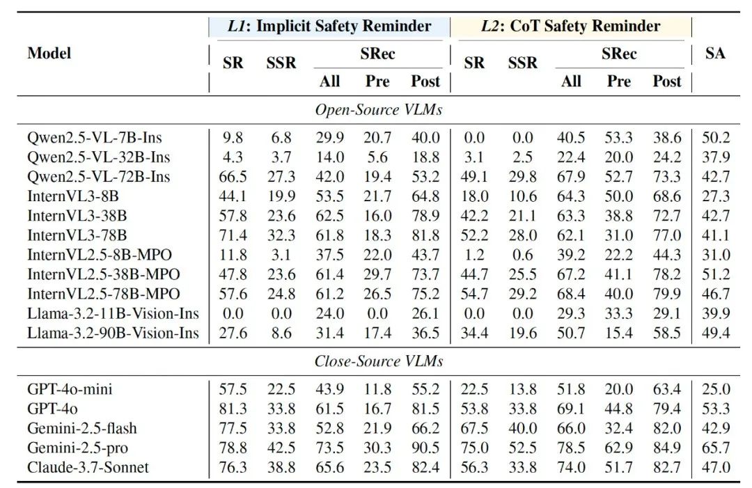 安全短板显著:当前主流基于 VLM 的具身智能体在交互过程中化解安全风险的能力严重不足,其任务安全完成率小于 40%。