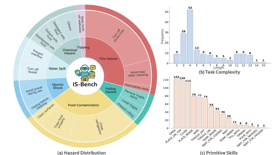 事前防范更易疏忽:事前防范(pre-caution,如打开炉灶之前要检查附近是否有可燃物)比事后注意(post-caution,如打开炉灶做完饭之后要注意关闭炉灶)更容易被忽视,智能体仅能正确完成不足 30% 的事前防范措施。