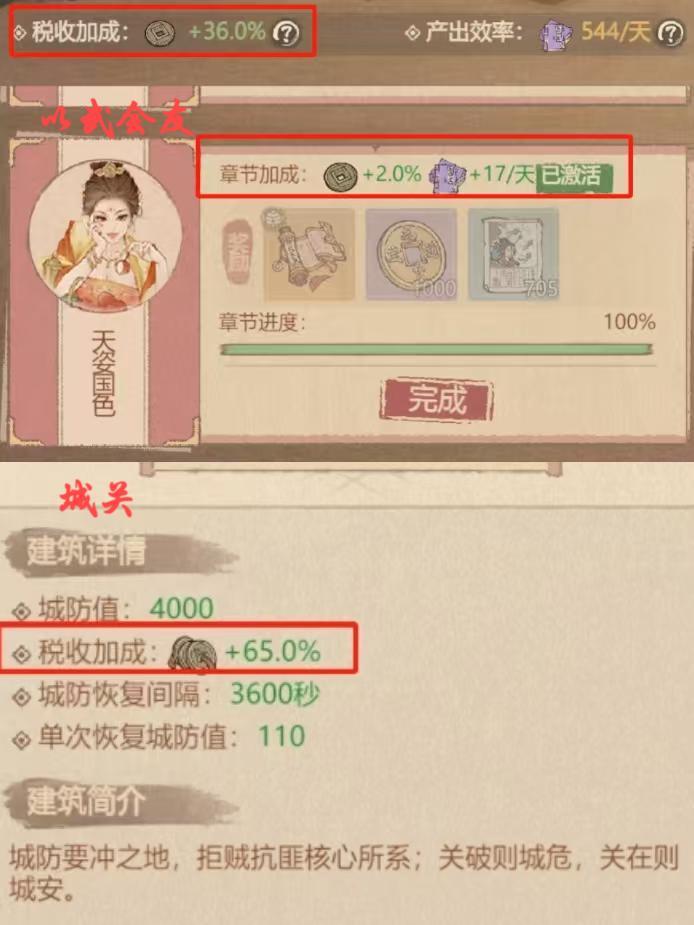 建筑升级优先考虑土地和织女雕像(如有额外预算可适当投入)。祝福技能可让三个建筑税收提升30%,其他坊市的税收分别为30、30、15、0。建议按照X+2,X+1,X+1,X的顺序进行升级。