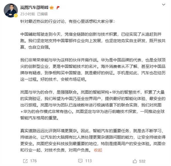 岚图与华为的合作,是强强联合。岚图的智能架构+华为的智慧技术,积累了大量的实测验证,我们希望为中国乃至全世界用户,提供最好的智能化体验、最安全的出行旅程。岚图与华为团队已连续数年进行极端场景下的联合实测,我们对岚图+华为的合作模式非常有信心。岚图坚定与华为进行前瞻技术探索,一同推动全球智能汽车格局的重塑。
