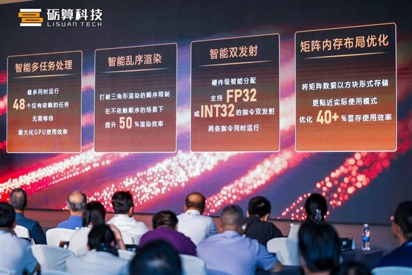 此外,砺算 7G106 还支持 FP32 或 INT32 的指令双发射,以方块形式存储矩阵数据等特性,可以优化 40% 的显存使用效率。