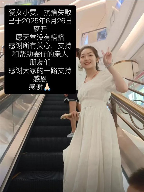 7月28日消息,据媒体报道,抗癌网红“闪闪发光的小雯”家人在社交平台上发布新消息,称“爱女小雯抗癌失败,于2025年6月26日离开,愿天堂没有病痛,感谢曾经关心支持和帮助小雯的所有人,谢谢你们”。