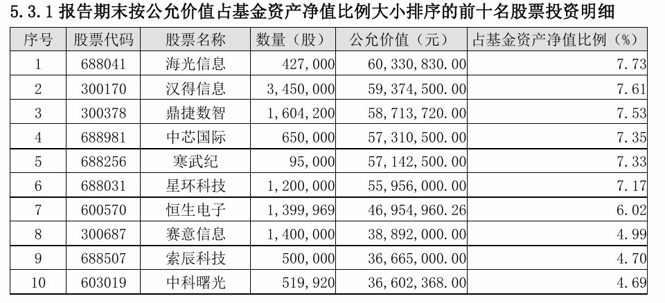 二季报显示,该基金股票资产集中投资于信息传输和软件和信息技术服务业,占基金净值的52.31%。其中,前十大重仓股包括海光信息、汉得信息、鼎捷数智等。