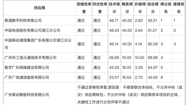 4月,项目公示了中标结果,联通数字科技有限公司中标,中标(成交)金额2488.23万元。湛江电信、湛江移动分别位居第二、第三中标候选人。