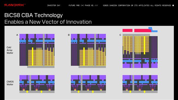 BiCS 9还采用了混合架构,首先单独制造CMOS控制电路晶圆、NAND闪存阵列晶圆,然后键合在一起,形成单一高性能封装——长江存储就是这么干的。