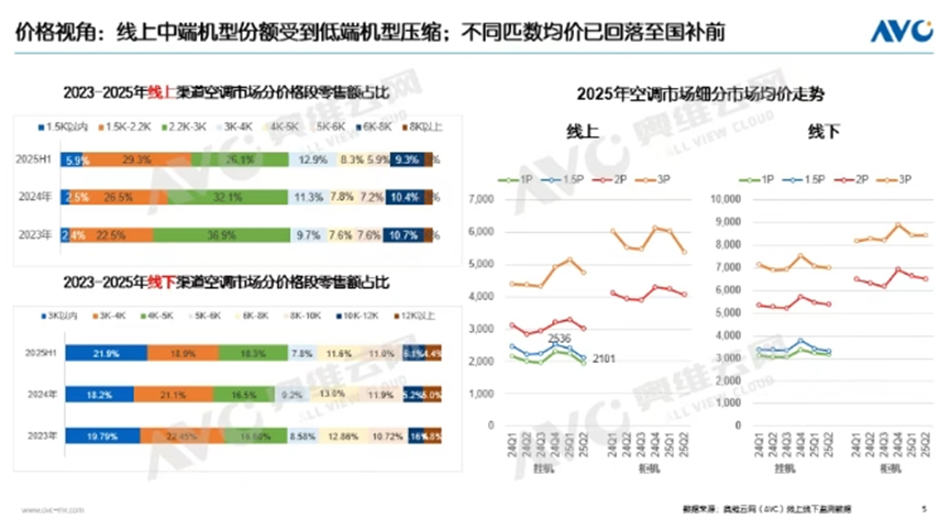 高温天气还带来价格修复契机。奥维云网显示,上半年行业深陷价格战,1.5匹挂机线上均价从2536元骤降至2101元。但7月高温催化下,零售价出现边际改善:W27-W28(6.30-7.13)线上/线下均价同比回升,新风空调线上均价增幅达7.8%。消费分层趋势下,高端机型与高性价比机型呈现“哑铃型”增长:6000元以上市场被COLMO等占据,而2000-3000元价位段成为美的、小米主战场。