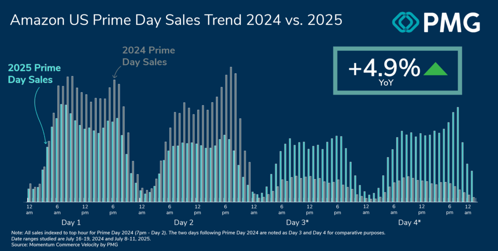 Momentum Commerce根据总销售额超75亿美元的数百家品牌企业的数据跟踪,发现了一个并不乐观的事实:即便在Prime Day这四天内商家的广告支出与促销资源投入达到空前规模,但他们在亚马逊渠道的销售同比平均增幅却仅为4.9%,远低于整体零售生态30.3%的平均涨幅。