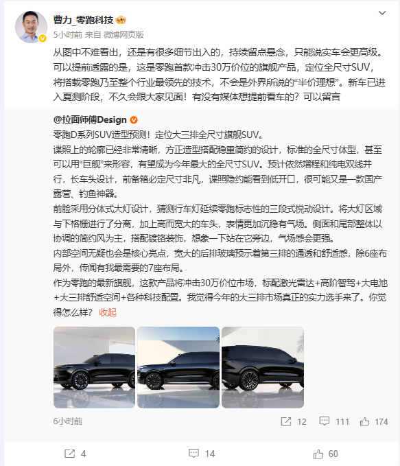 曹力表示,这是零跑首款冲击30万价位的旗舰产品,定位全尺寸SUV,将搭载零跑乃至整个行业最领先的技术,不会是外界所说的“半价理想”。