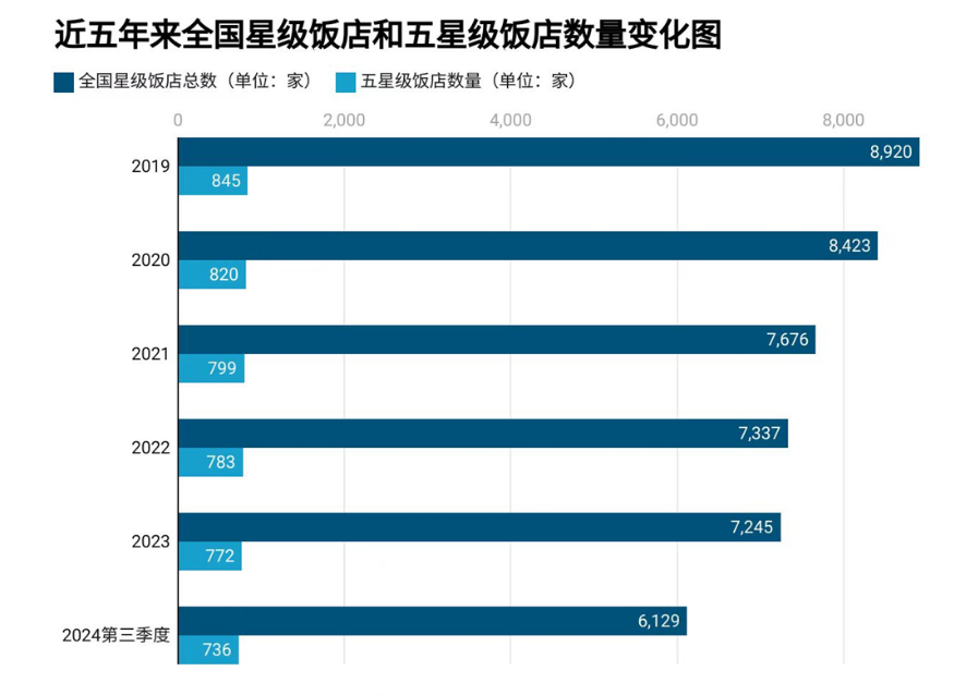 文化和旅游部的官方统计显示,截至2024年三季度,全国五星级饭店仅存736家,较2019年的845家减少近13%。