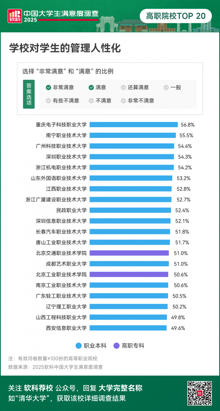 2025软科中国大学生满意度调查中,针对高职院校学生的问题设置与普通本科学生的问卷略有不同,以期能够更加符合高等职业教育的特色和现实情况。