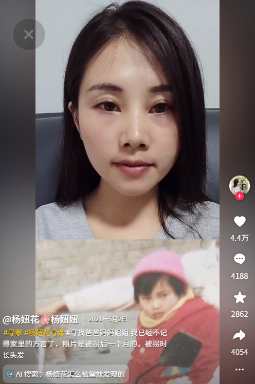 但直到 8 年后,她在抖音上发的一条寻亲视频被自己堂妹刷到,才最终认亲成功。