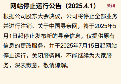 中国最早成立的寻亲网站之一——“ 中国寻亲网 ”,关停了。