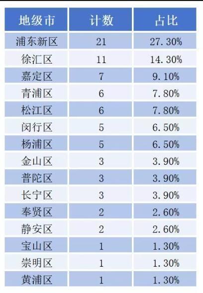 从地域分布看,根据地级市划分,浦东新区有21家,占比27.3%,优势显著;徐汇区有11家,占比14.3%;嘉定区有7家,占比9.1%,位居第三。