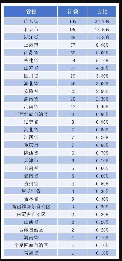 从地域分布看,根据省份划分,广东有197家,占比22.7%;北京有 160家,占比18.5%;位居第一梯队。
