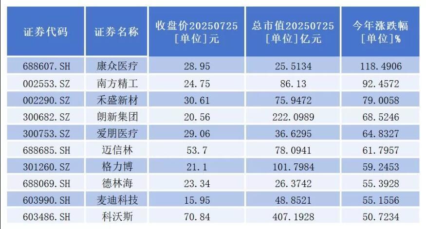 从二级市场表现看,截至7月25日收盘,今年以来涨幅超过50%的有10家,分别是康众医疗、南方精工、禾盛新材、朗新集团、爱朋医疗、迈信林、格力博、德林海、麦迪科技、科沃斯。