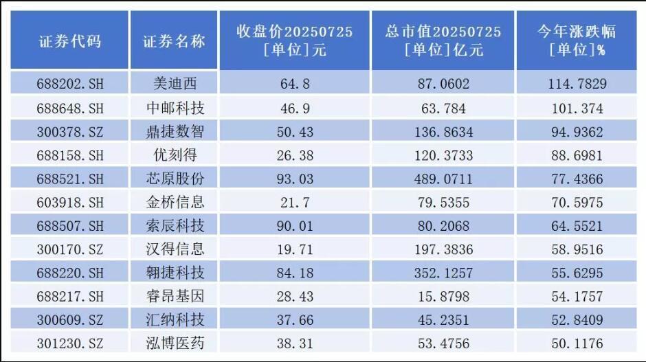 从二级市场表现看,截至7月25日收盘,今年以来涨幅超过50%的有12家,分别是美迪西、中邮科技、鼎捷数智、优刻得、芯原股份、金桥信息、索辰科技、汉得信息、翱捷科技、睿昂基因、汇纳科技、泓博医药。