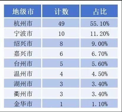 从地域分布看,根据地级市划分,杭州有49家,占比55.1%,优势显著;宁波有10家,占比11.2%;绍兴有8家,占比9.0%,位居第三。