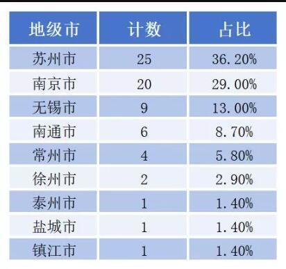 从地域分布看,根据地级市划分,苏州有25家,占比36.2%;南京有20家,占比29.0%,两者实力相近。此外,无锡有9家,占比13.0%,位居第三。
