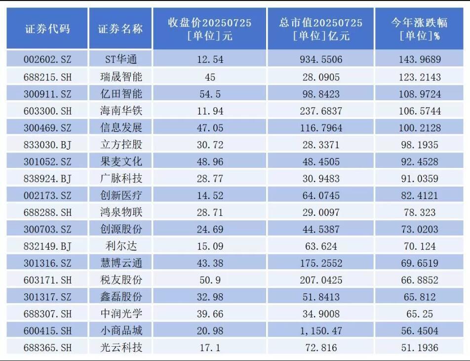 从二级市场表现看,截至7月25日收盘,今年以来涨幅超过50%的有18家上市公司,分别是ST华通、瑞晟智能、亿田智能、海南华铁、信息发展、立方控股、果麦文化、广脉科技、创新医疗、鸿泉物联、创源股份、利尔达、慧博云通、税友股份、鑫磊股份、中润光学、小商品城、光云科技。