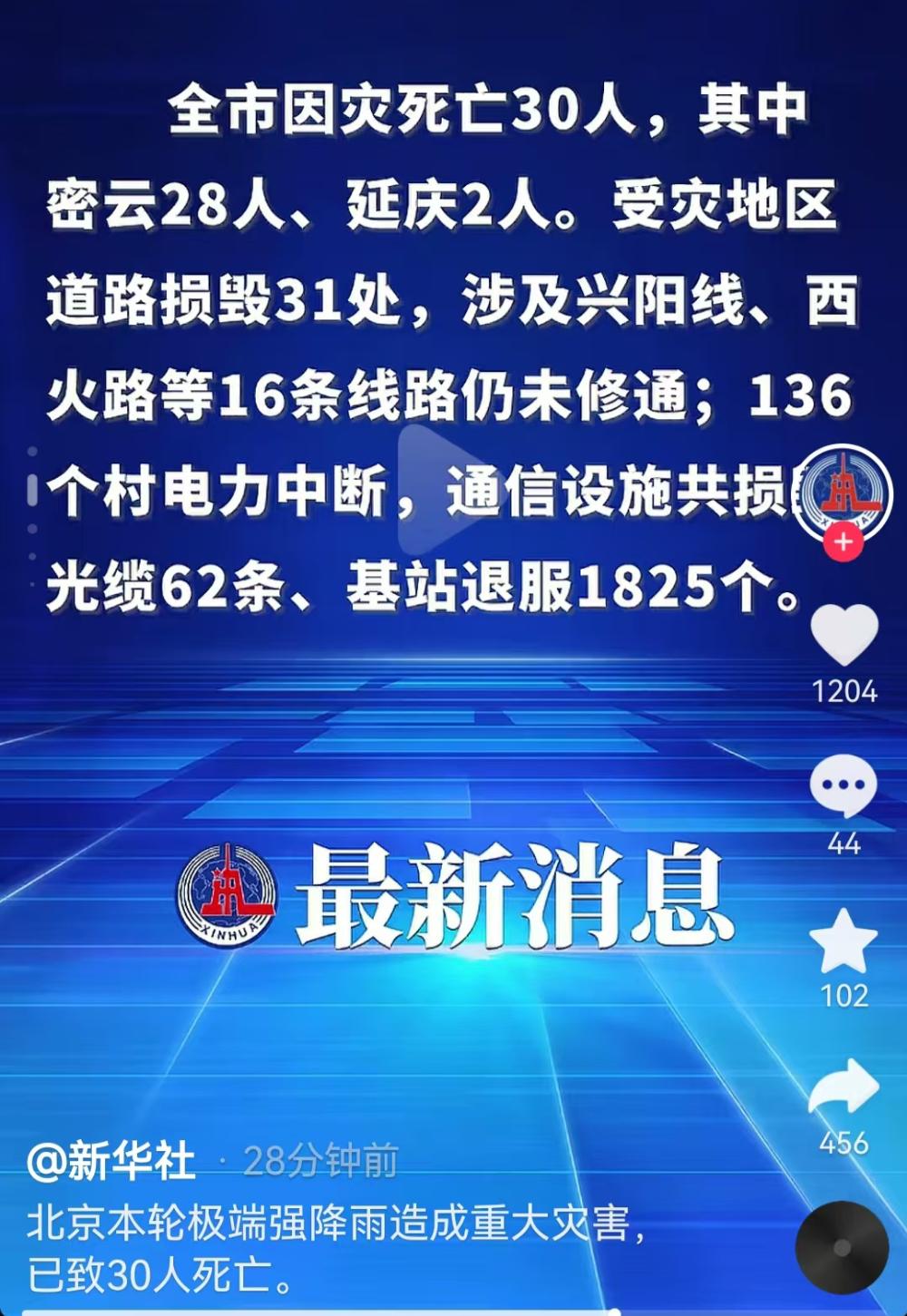 据新华社消息,北京本轮极端强降雨天气,已导致全市因灾死亡30人,其中密云28人、延庆2人。