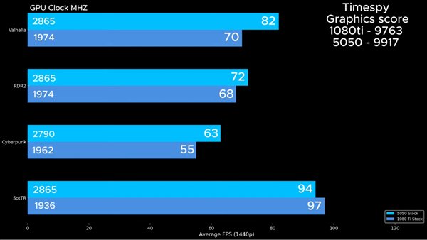 在默认频率下,RTX 5050就已经在多数游戏如《荒野大镖客2》《赛博朋克2077》等中领先GTX 1080 Ti。