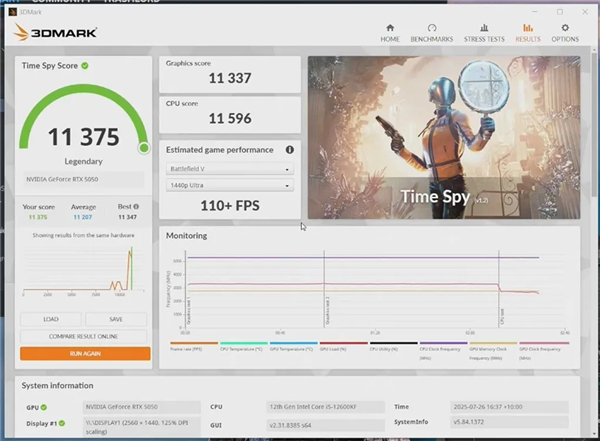 最终RTX 5050不仅在性能上超越了1080 Ti,还在3DMark Time Spy的基准测试中取得了11377,这也是该型号显卡的前六名成绩。