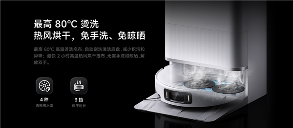 基站方面,米家扫拖机器人5 Pro采用高温洗烘自清洁基座,支持智能复洗拖布、最高 80°C烫洗、最快2小时热风烘干、底盘自动刮洗、自动集尘,上下水版还支持自动换水、自动加清洁剂。