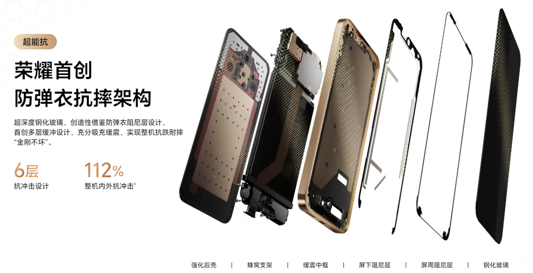 荣耀X70搭载荣耀首创防弹衣抗摔架构,是行业首个通过SGS金标五星整机综合可靠性认证的手机。2.5m防摔新高度,10+种石头路面防护,刀片级防刮耐磨,行业防护等级天花板。