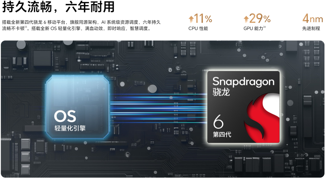 核心配置上,荣耀X70搭载6.79英寸1.5K荣耀绿洲护眼屏,配备5000万像素OIS光学防抖主摄,支持NFC、红外遥控、双扬声器等。骁龙6 Gen4处理器,搭配搭载全新 OS 轻量化引擎流畅使用六年,毫无问题。