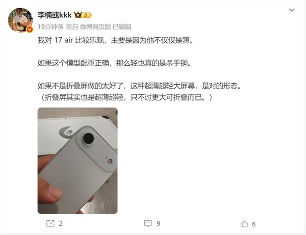 他表示:我对17 Air比较乐观,主要因为它不仅仅薄,如果这个模型配重正确,那么轻也是杀手锏。如果不是折叠屏做的太好了,这种超薄超轻大屏幕是对的形态(折叠屏也是超薄超轻,只不过更大可折叠而已)。