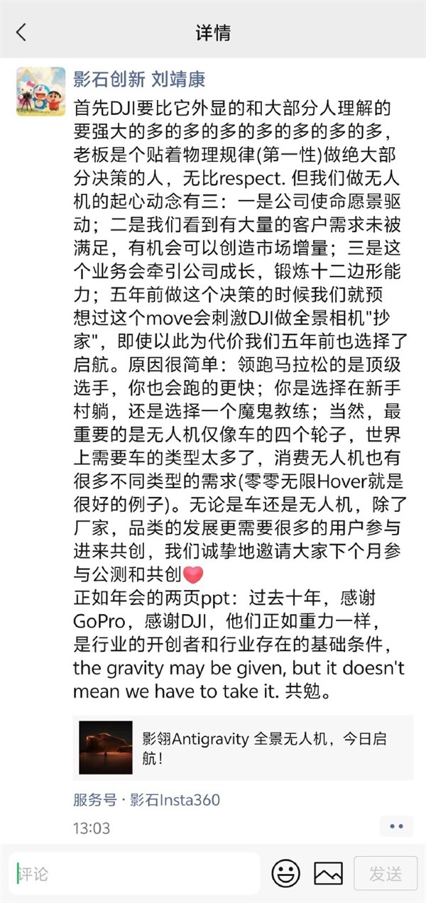 一家专做全景相机、运动相机等摄影产品的公司为何会杀入无人机市场?今日,影石创始人刘靖康发布朋友圈,称做无人机的起心动念有三个,并称无比尊重大疆。