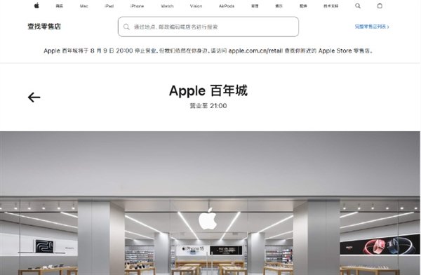 快科技7月29日消息,近日,苹果中国官网显示,位于大连百年城的Apple Store 店将于今年8月9日20:00停止营业。