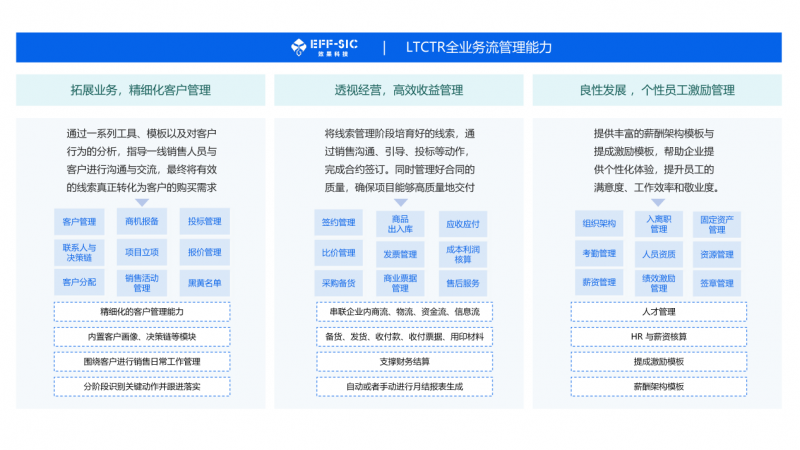 ·全业务流管理能力:业务集成化管理,解决从项目机会到客户回款再到员工激励的全业务流程问题。