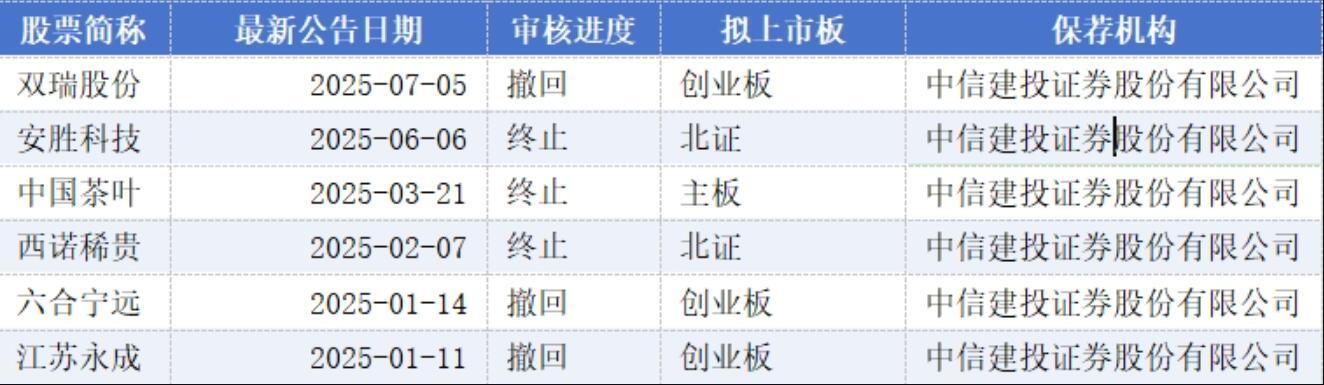 在撤回+终止IPO申请的企业中,还出现同一券商旗下项目接连撤回的现象。根据同花顺数据,民生证券、中信证券、中信建投的撤回项目最多,均为6个。