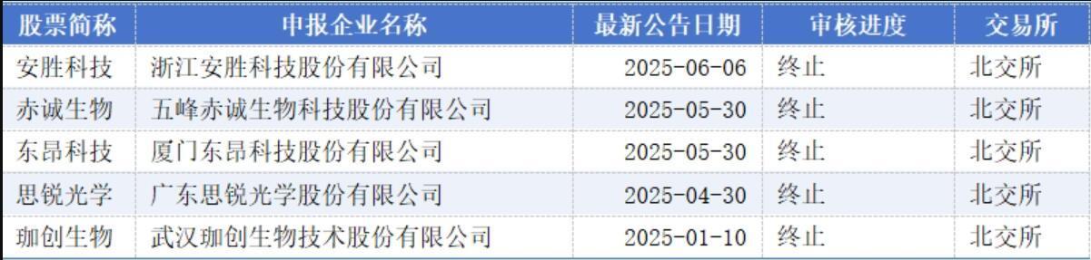 较为引人注目的是,包括安胜科技、赤诚生物、东昂科技、思锐光学、珈创生物在内的5家企业的IPO申请材料在2024年才刚刚被受理,但在今年就已经全部显示为终止状态,且均为北交所上市企业。