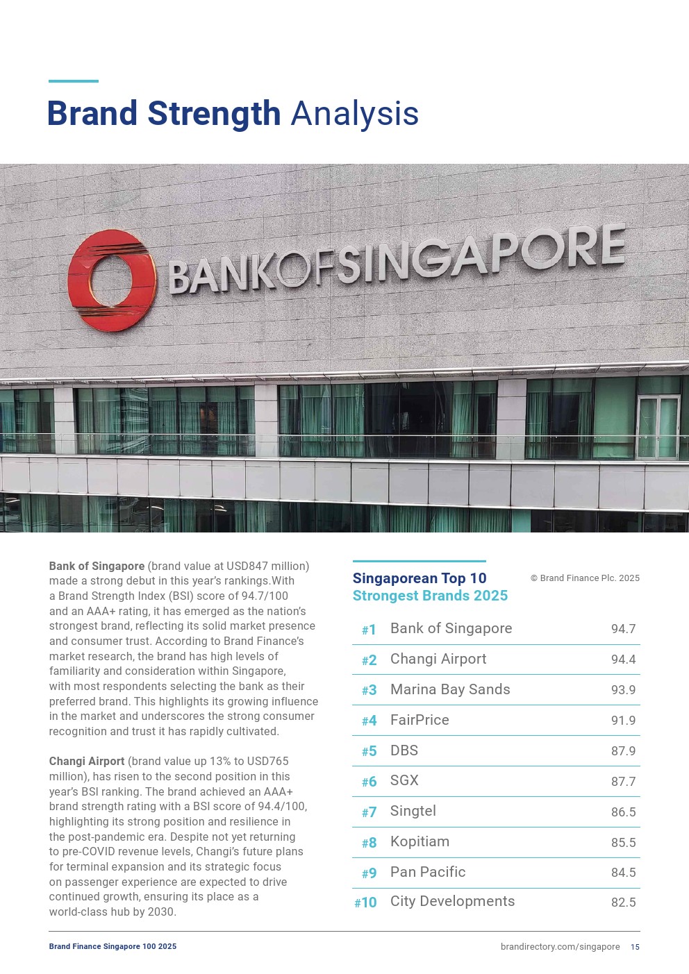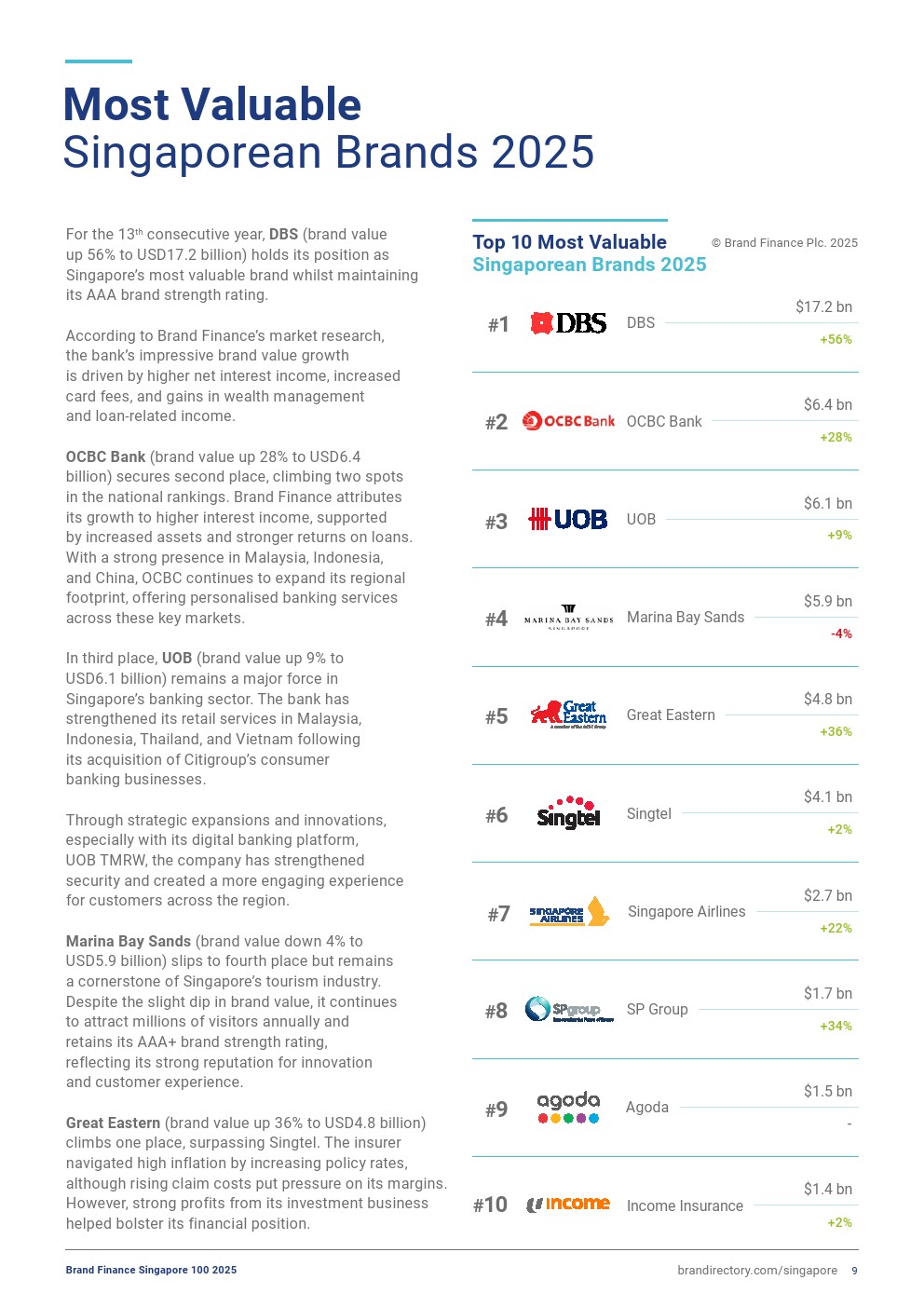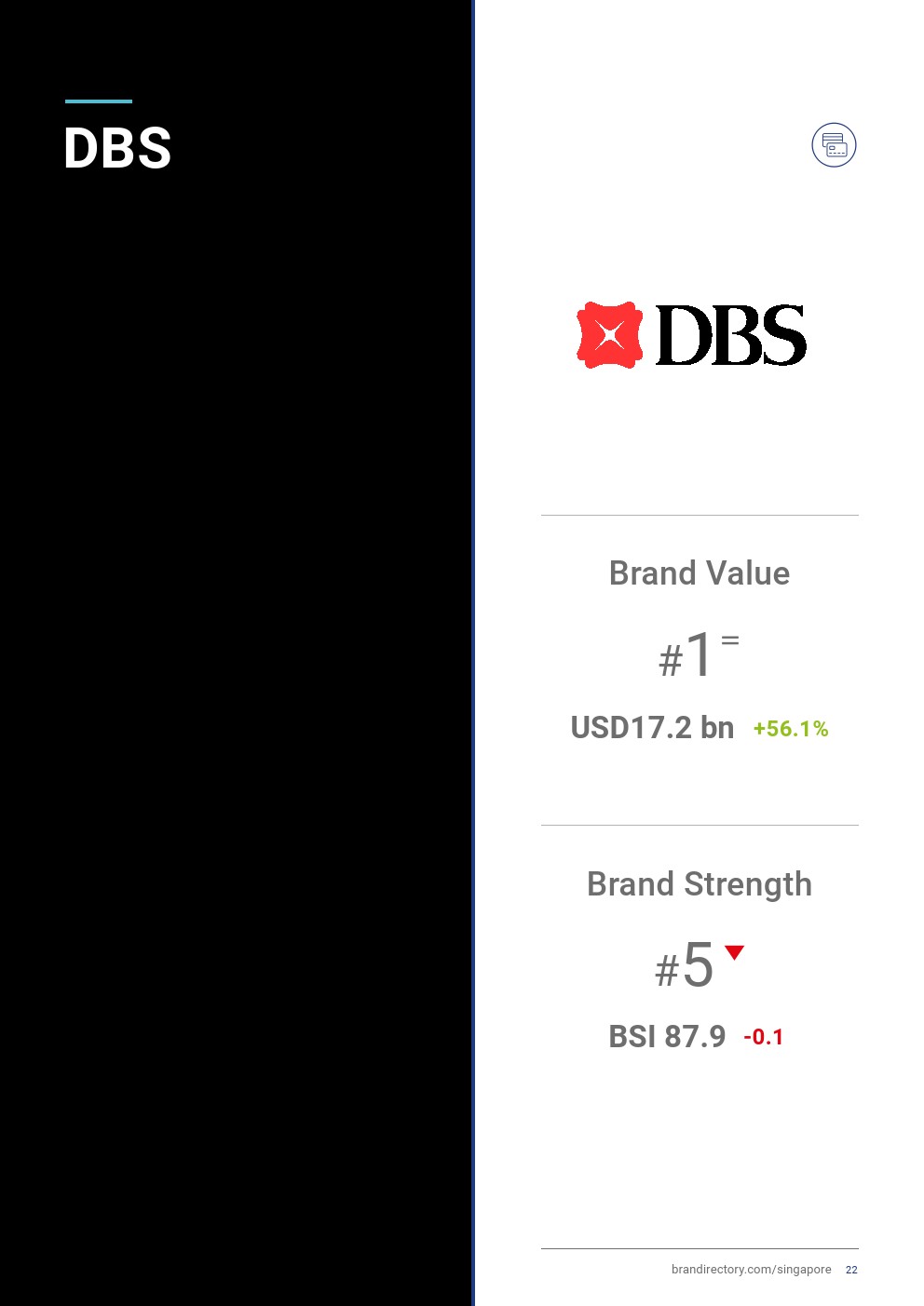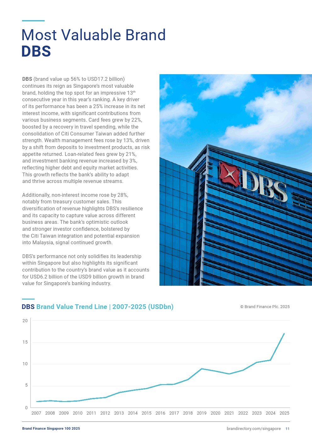 DBS银行(品牌价值增长56%,达到172亿美元)连续第13年保持新加坡最具价值品牌地位,同时维持其AAA级品牌强度评级。