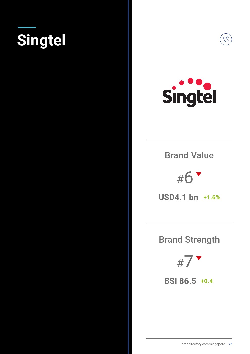 新电信(Singtel,品牌价值增长2%,达到41亿美元)下降一位,成为今年第六大最具价值新加坡品牌。