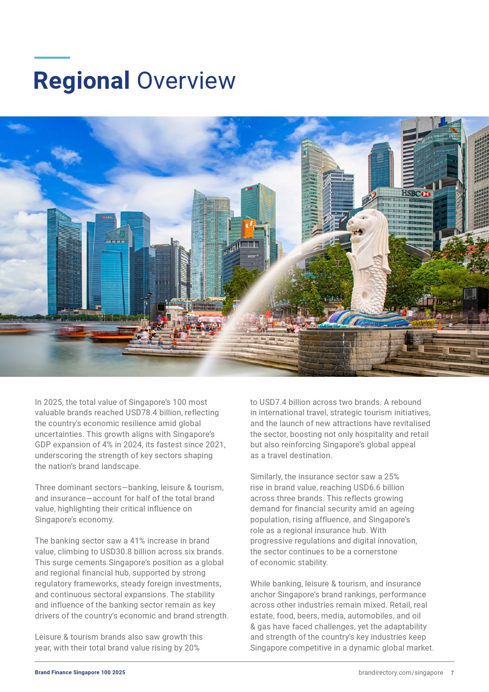 银行、休闲旅游和保险三大主导行业占品牌总价值的一半,凸显它们对新加坡经济的关键影响。