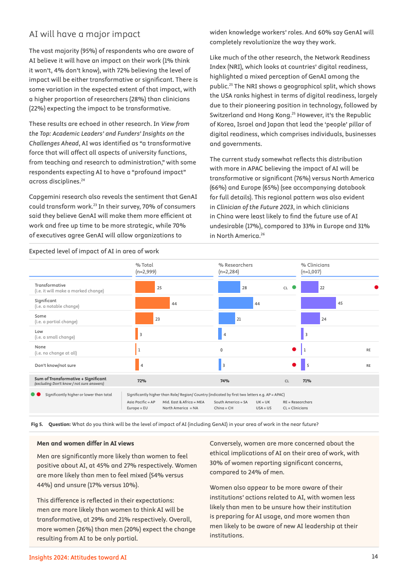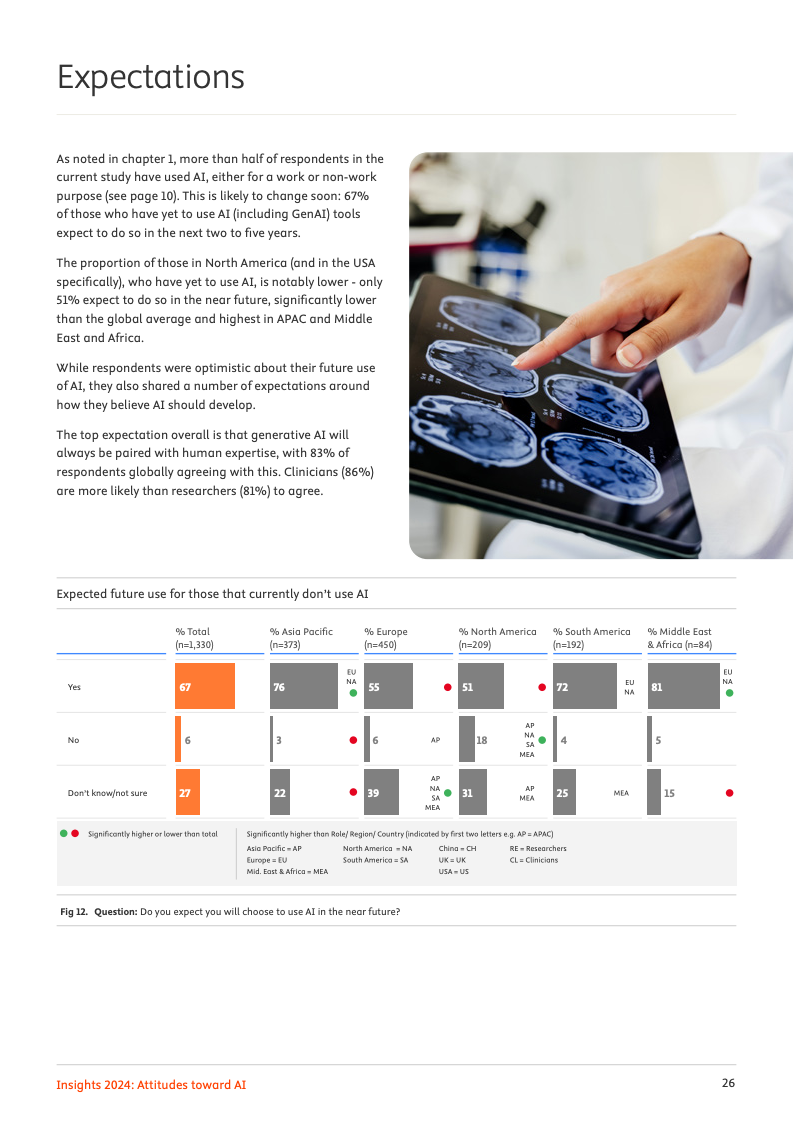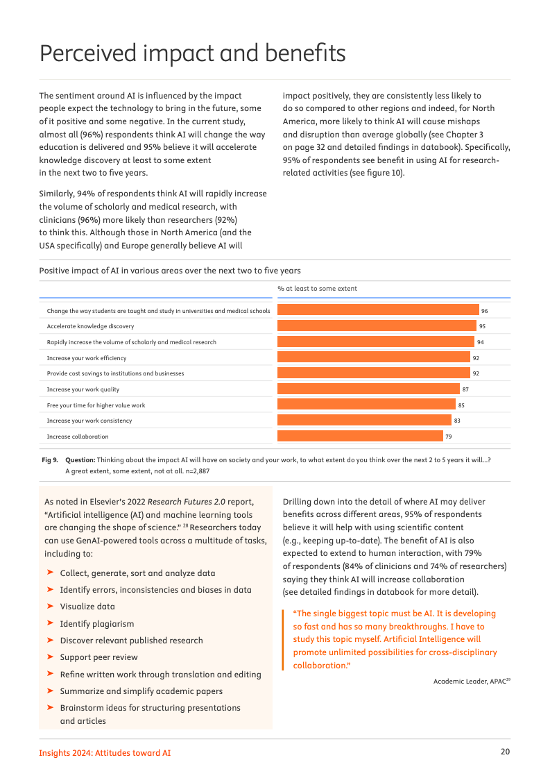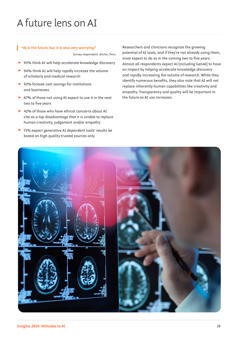 尽管实际应用尚在起步阶段,专业领域对人工智能的未来影响力抱有极高期望。高达72%的受访者预见,人工智能将对其工作领域产生变革性或重大影响。其中,95%的人相信人工智能会加速知识发现的进程,94%认为它将推动学术与医学研究成果数量的激增,而92%的人则预期机构与企业能因此实现成本节约,乐观情绪弥漫于整个专业社群。