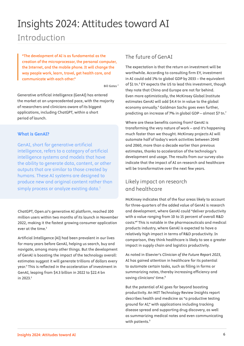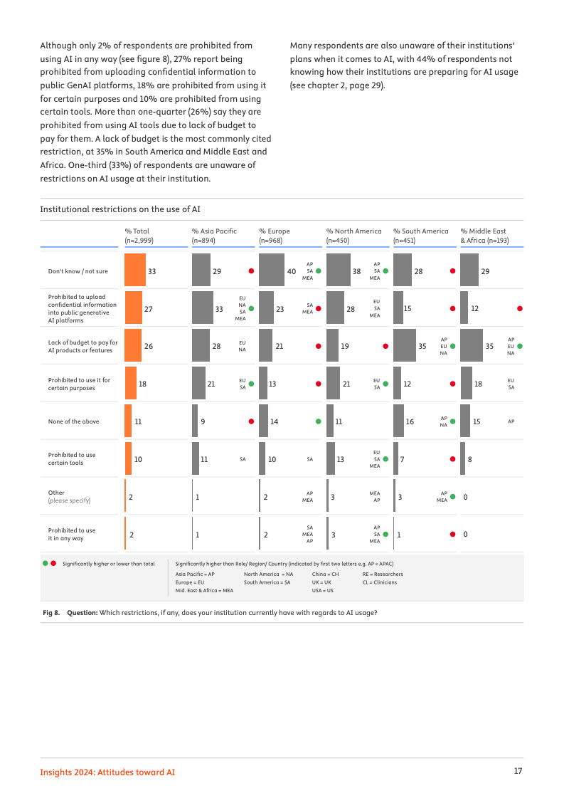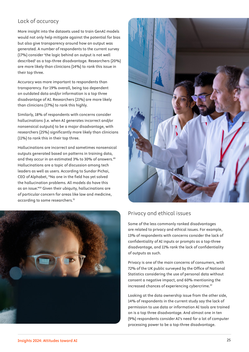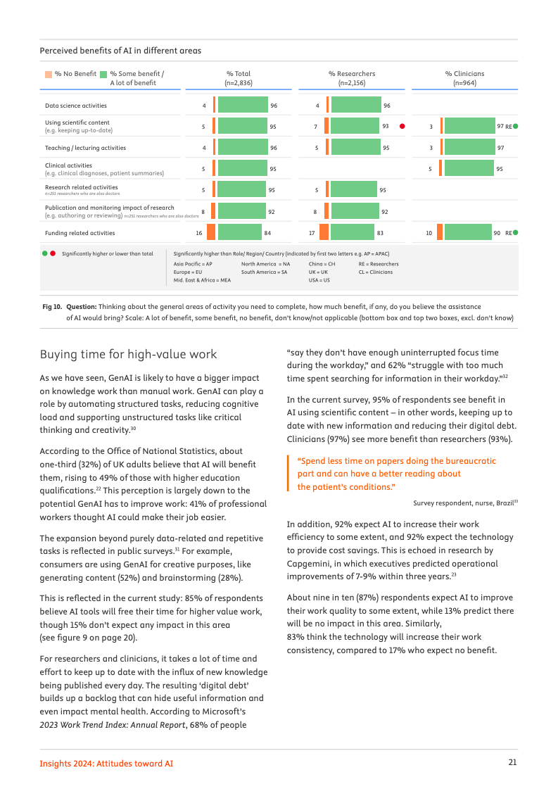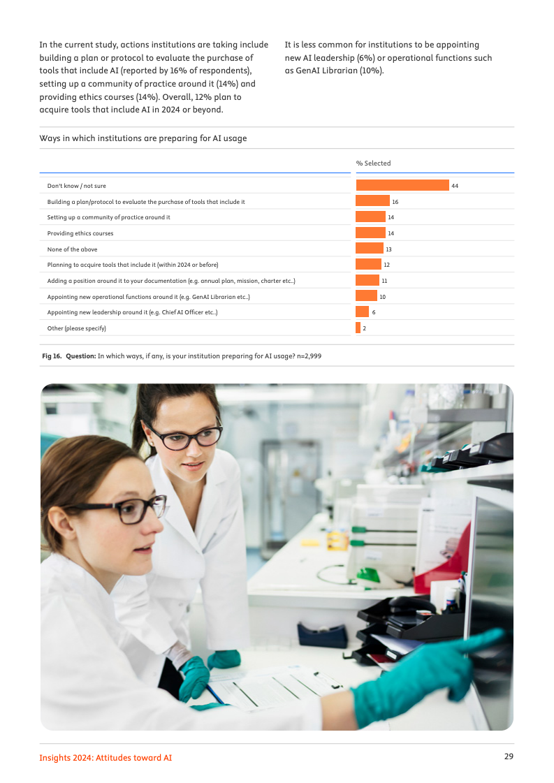 尽管实际应用尚在起步阶段,专业领域对人工智能的未来影响力抱有极高期望。高达72%的受访者预见,人工智能将对其工作领域产生变革性或重大影响。其中,95%的人相信人工智能会加速知识发现的进程,94%认为它将推动学术与医学研究成果数量的激增,而92%的人则预期机构与企业能因此实现成本节约,乐观情绪弥漫于整个专业社群。
