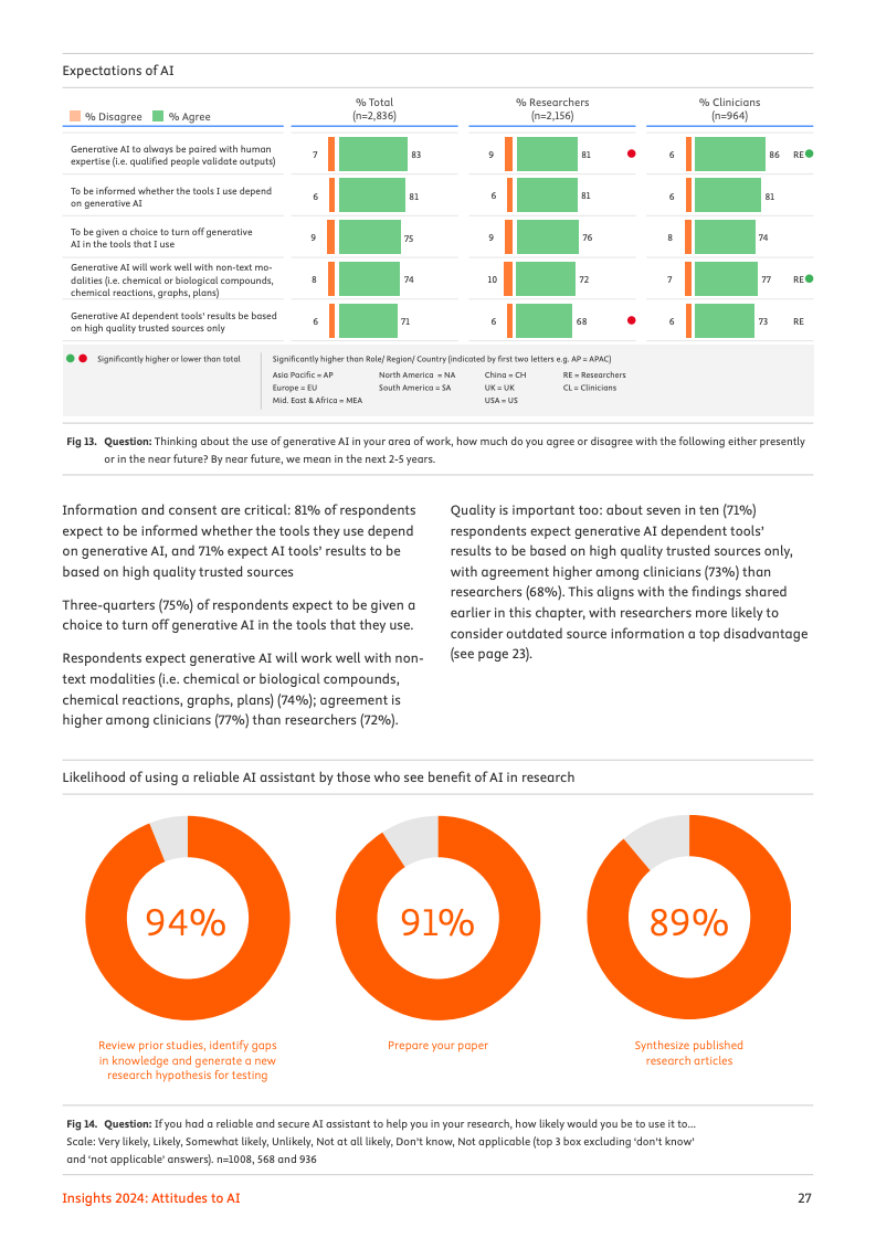 信任的构建成为人工智能能否在专业领域行稳致远的核心命题。报告指出,提升信任的关键在于确保输出的准确、道德且无害,58%的受访者认为这会“极大地”增强他们的信任。同时,使用高质量、经同行评审的内容进行模型训练(57%)以及默认引用参考文献以保证透明度(56%),也被视为构建信任的基石。