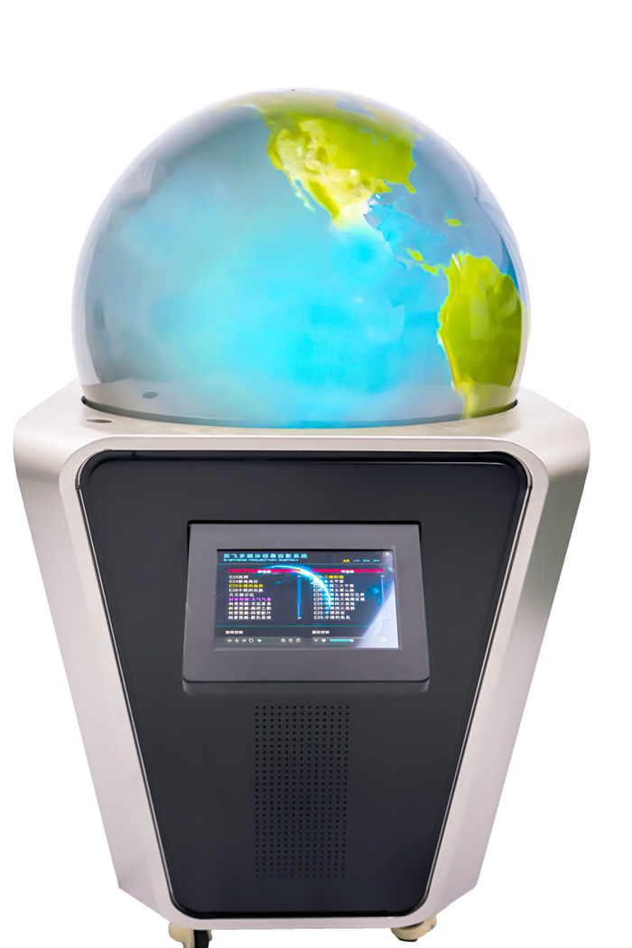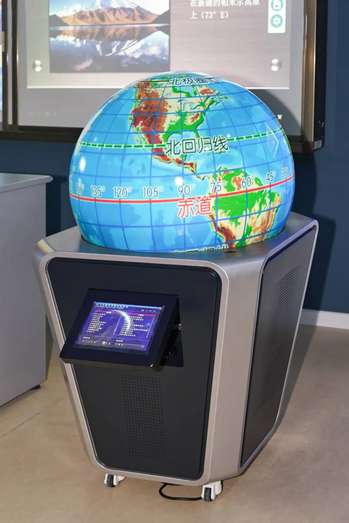 数字化地理教室则将广阔的天地搬进了课堂。多媒体球幕投影演示仪是其数字化地理教室的核心教学设备,以沉浸式技术重构地理知识呈现方式。该设备采用直径 1.2 米的无缝球形幕布悬浮设计,搭载 4K 超清投影技术,可逼真还原地球全貌、太阳系行星运动及自然现象。师生只需通过手势操控,即可实现视角缩放、场景切换,从宏观星系运转到微观地貌侵蚀一键呈现。