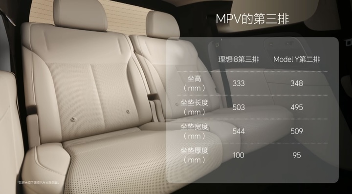 李想称,i8 的第三排坐姿、坐垫长度和宽度均达到了优秀 MPV 的水准,甚至比 Model Y 的二排还要舒服,且后备箱在三排满座时,进深依然超过 L9,能够容纳两个 28 寸的行李箱。
