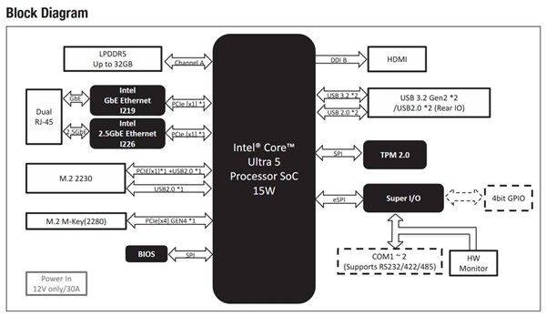 内存是单条单通道LPDDR5-6400,最大容量32GB。存储支持单个M.2 2280,PCIe 4.0 x4或者SATA通道。网络是Intel I226 2.5G+I219 1G双网卡。声卡则是没有的。