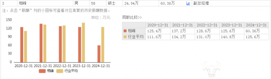 2024年,相峰的薪酬为60.36万元,和2023年的125.6万元薪酬相比下降了65.24万元,降幅达到52%。