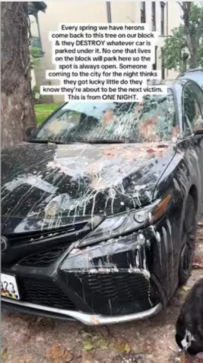 外地人不熟悉这里的情况,误以为是自己运气好,捡漏得了唯一空着的免费停车位,殊不知自己的车子竟成了黄冠夜鹭一家的“移动厕所”。