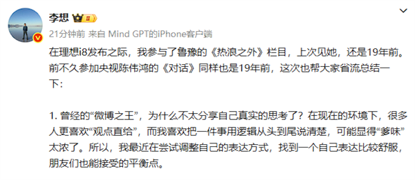 李想表示:在现在的环境下,很多人更喜欢“观点直给”,而我喜欢把一件事用逻辑从头到尾说清楚,可能显得“爹味”太浓了。