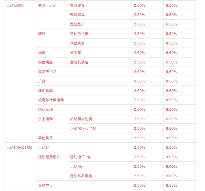运动及娱乐类目中,野营寝具、家具、垫子等露营远足类目佣金为6.5%;电动自行车、渔船及装备、水上运动类目佣金为6.5%;高尔夫用品、乐器、球拍运动、轮滑及滑板运动、团队运动等佣金均为8.5%。