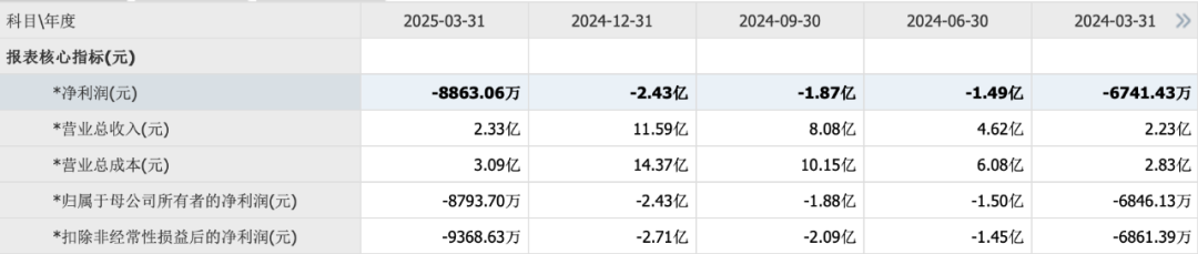 根据财报,中文在线2024年营业收入为11.59亿元,同比下降17.73%,归母净亏损为2.43亿元,同比下降371.58%。而到了一季度,公司营业收入为2.33亿元,同比增长4.67%,归母净亏损为8793.70万元。